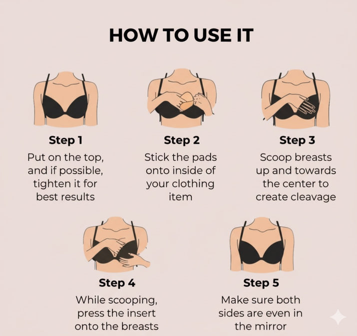 Outfit first, position the inserts inside your clothing or bra, then lift and press your breasts onto the inserts for a secure fit.